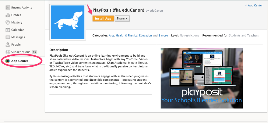 Note: When installing the app, do not select 'Course Admins Only' as your students will be unable to view PlayPosit content. - PlayPosit will appear in the left sidebar. Launching the app will automatically create a PlayPosit instructor account for you.