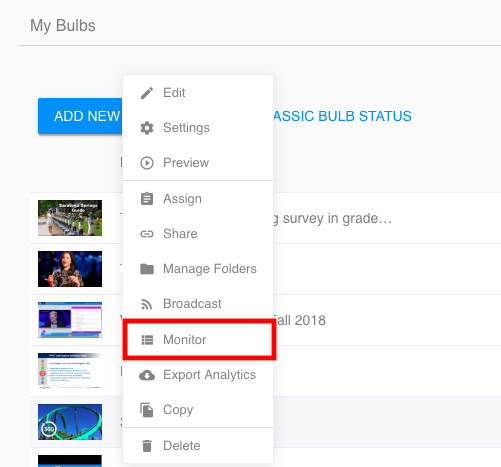- Find the bulb you want to view data for. Click on the bulb icon or the triple dots > Monitor.