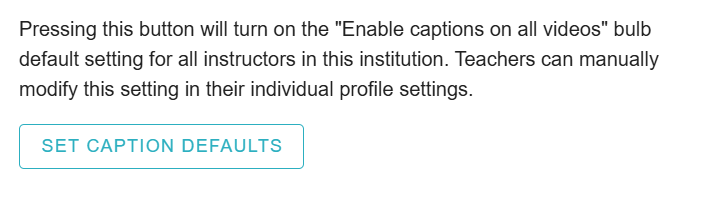 Click the Set Caption Defaults button to enable captions on all Bulbs in the license. Instructors can manually modify the caption setting in their account settings and Bulb settings.