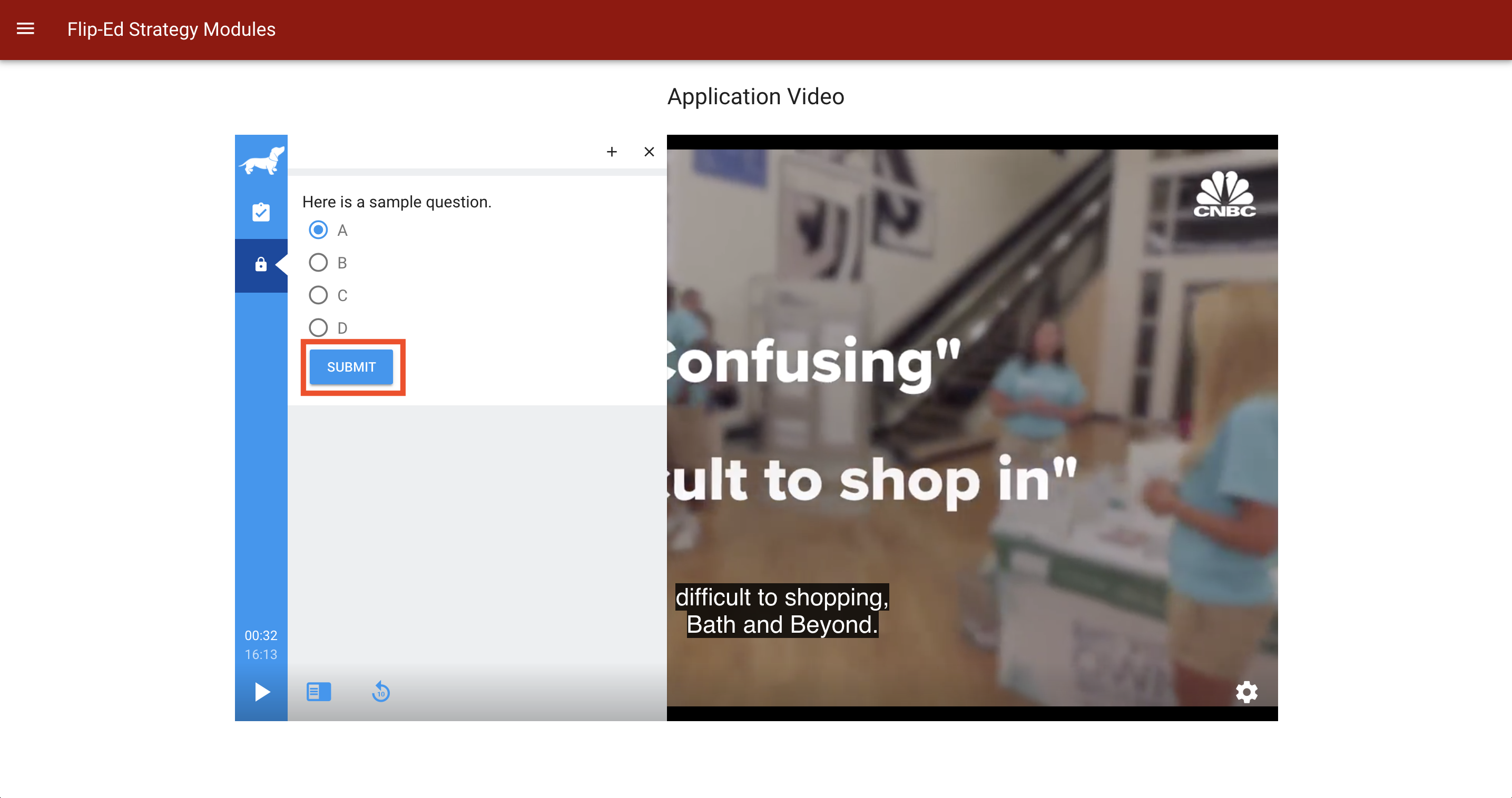 Questions will pop up in the left sidebar menu as you are watching the video. Answer the question then click Submit.