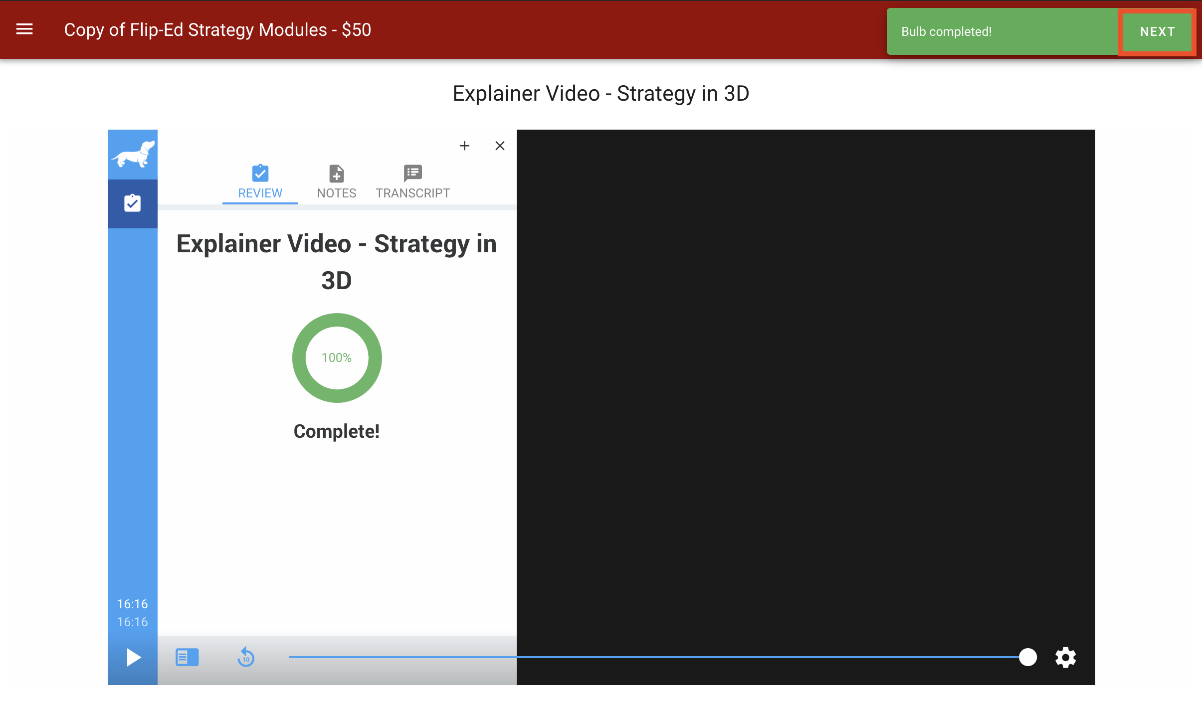 You can proceed to the next video by clicking next or click the triple line sidebar menu to open the module playlist. Once you have completed the video, a checkmark will appear next to the video.
