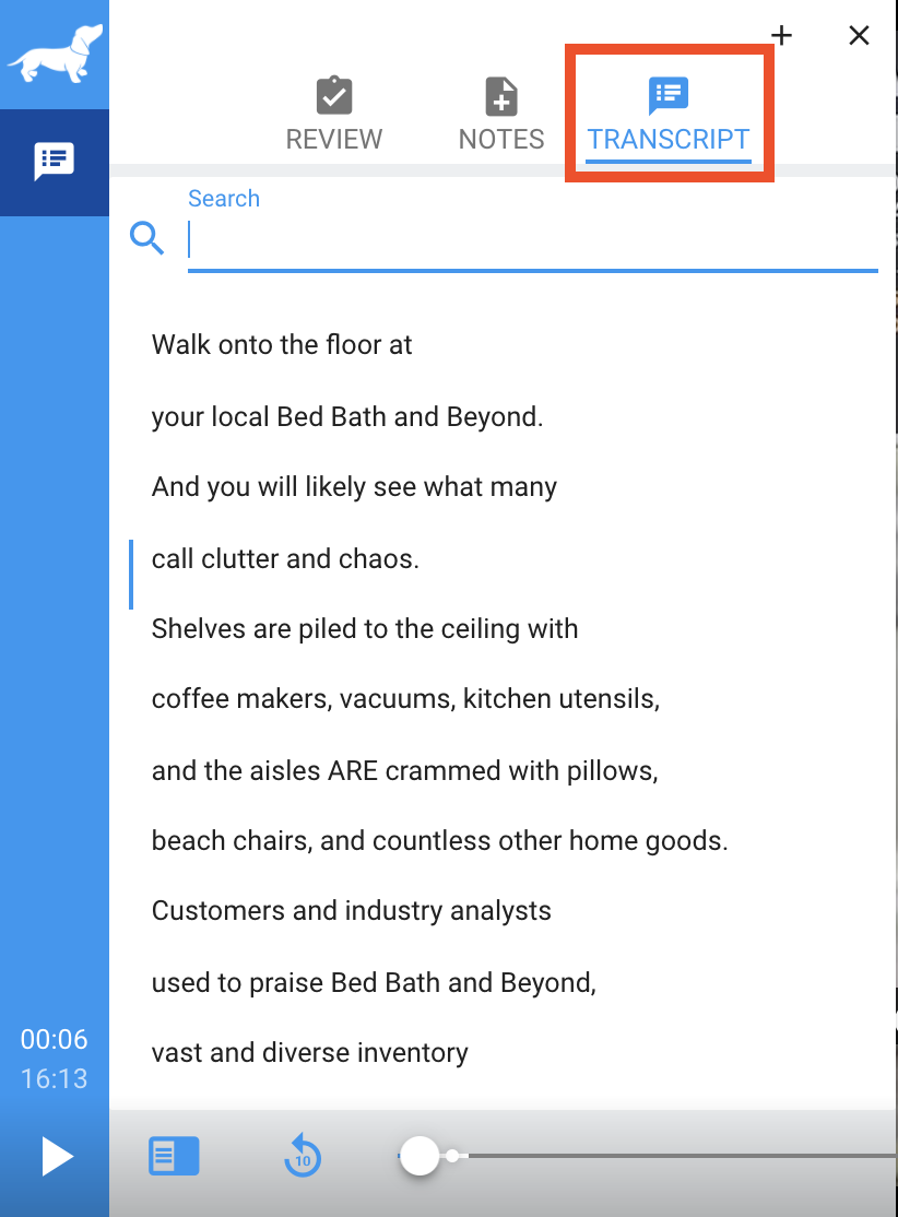 Click the Transcripts tab. Transcripts will appear as the video plays. Click on any transcript line to be brought to that specific part of the video or search for keywords in the transcript. Please note that you are not able to skip ahead if your instructor does not have fast forward enabled.