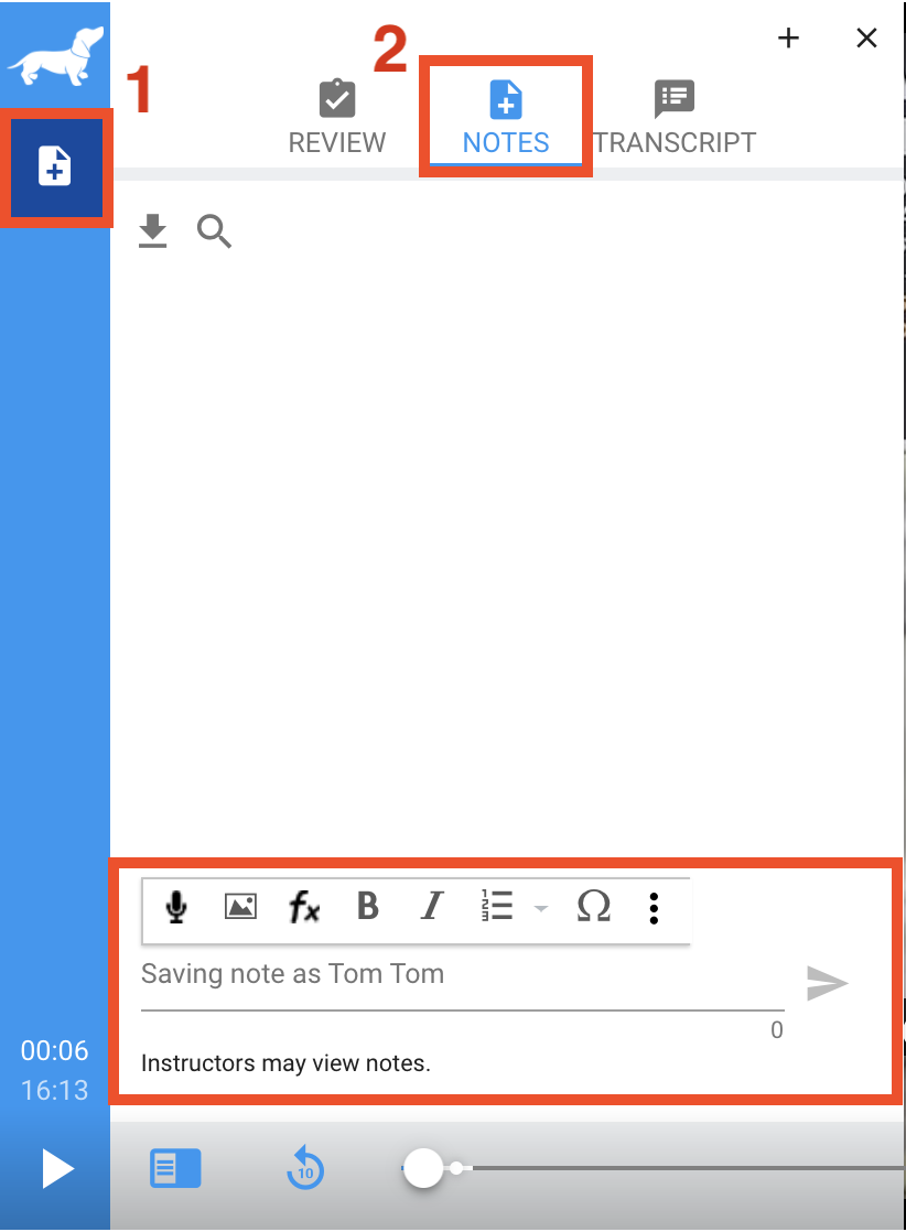 If you need to take notes on the video, click on the sidebar icon, and then on the Notes tab. Type your note in to the bottom of the Notes tab and click the blue icon next to it to save your note.