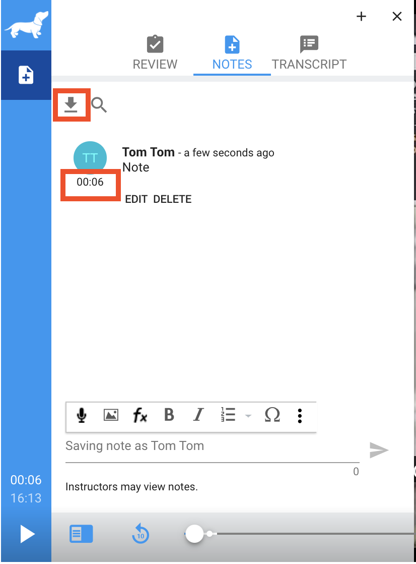 Each note you make will also save a clickable timestamp that you can use to jump back or forward to the point in the video when you made that note. You can also download a text file of your notes by clicking on the grey download icon at the top of the Notes tab.